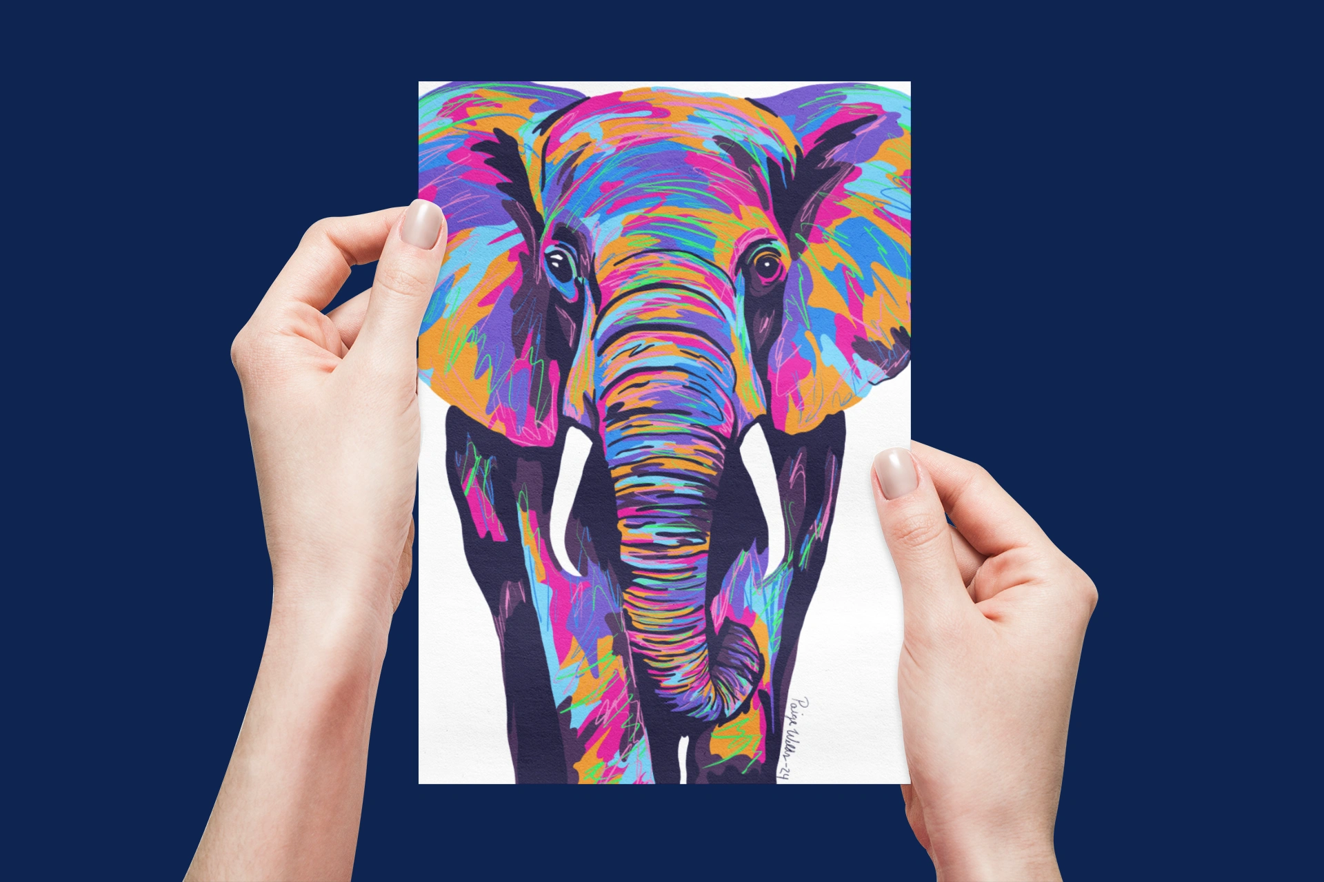 This unique, hand-drawn and designed poster captures the personality of elephants through expressive detail and color. Originally created with Posca and gel pens, the artwork is printed on thick, museum-quality matte paper using a multicolor, water-based inkjet printing technique for rich, vivid tones and exceptional clarity.