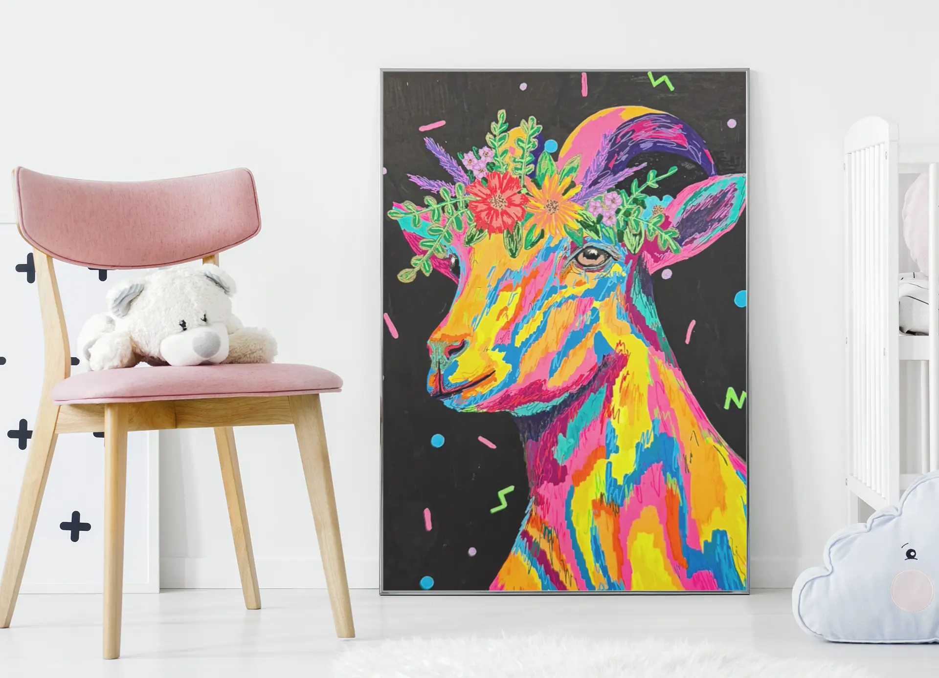 This unique, hand-drawn and designed poster captures the playfulness of a goats personality through expressive detail and color. Originally created with Posca and gel pens, the artwork is printed on thick, museum-quality matte paper using a multicolor, water-based inkjet printing technique for rich, vivid tones and exceptional clarity.