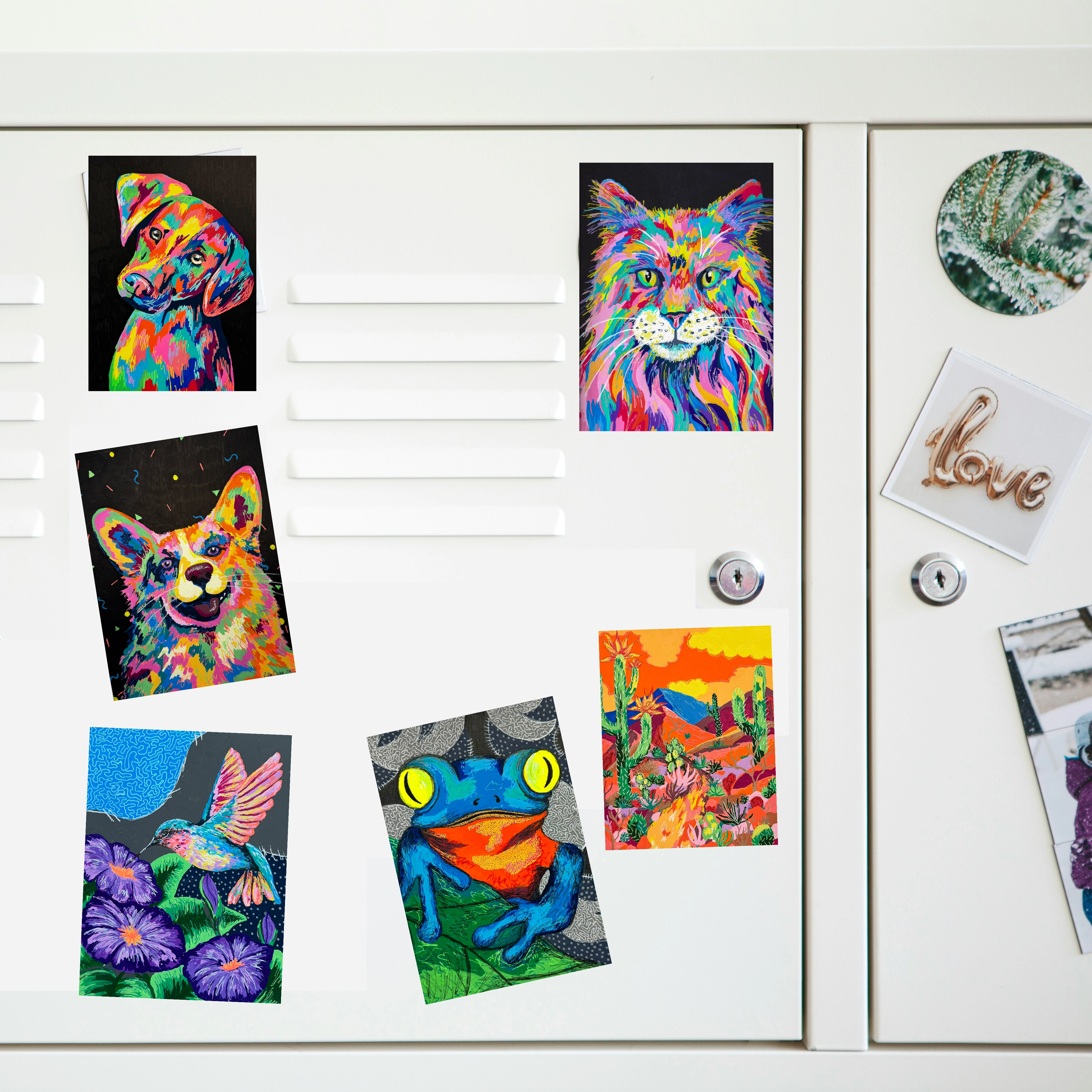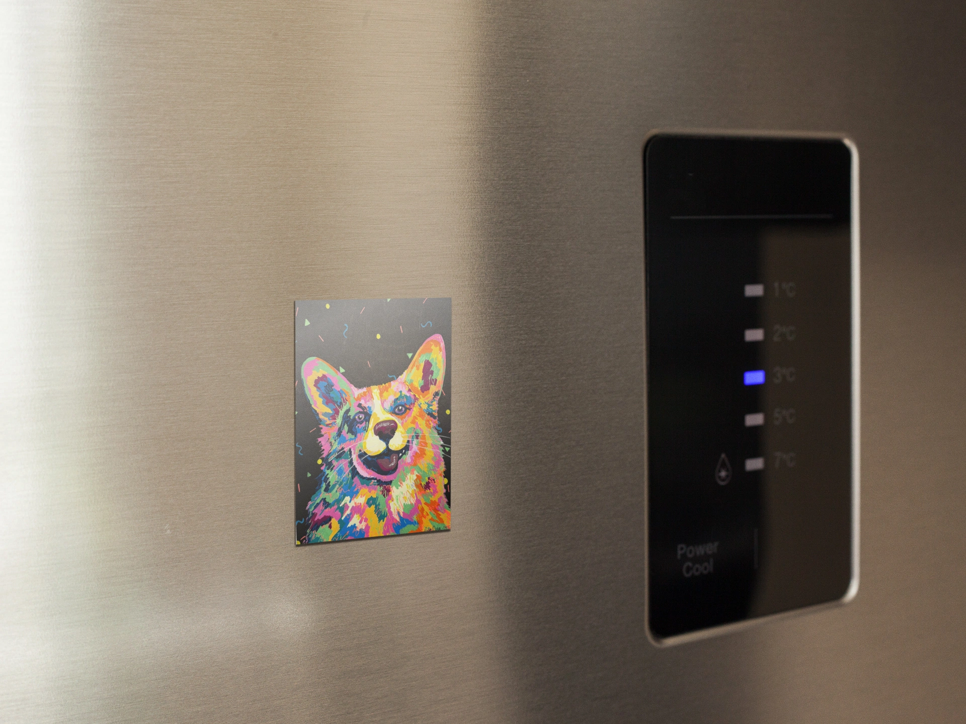 This one-of-a-kind, hand-drawn piece showcases the playfulness of a corgi puppy and is available as a magnet in 3 sizes. Originally created using Posca Paint Pens and gel pens, each design is printed on museum-quality matte paper using a multicolor, water-based inkjet technique, then carefully mounted onto a DIYMAG magnet sheet