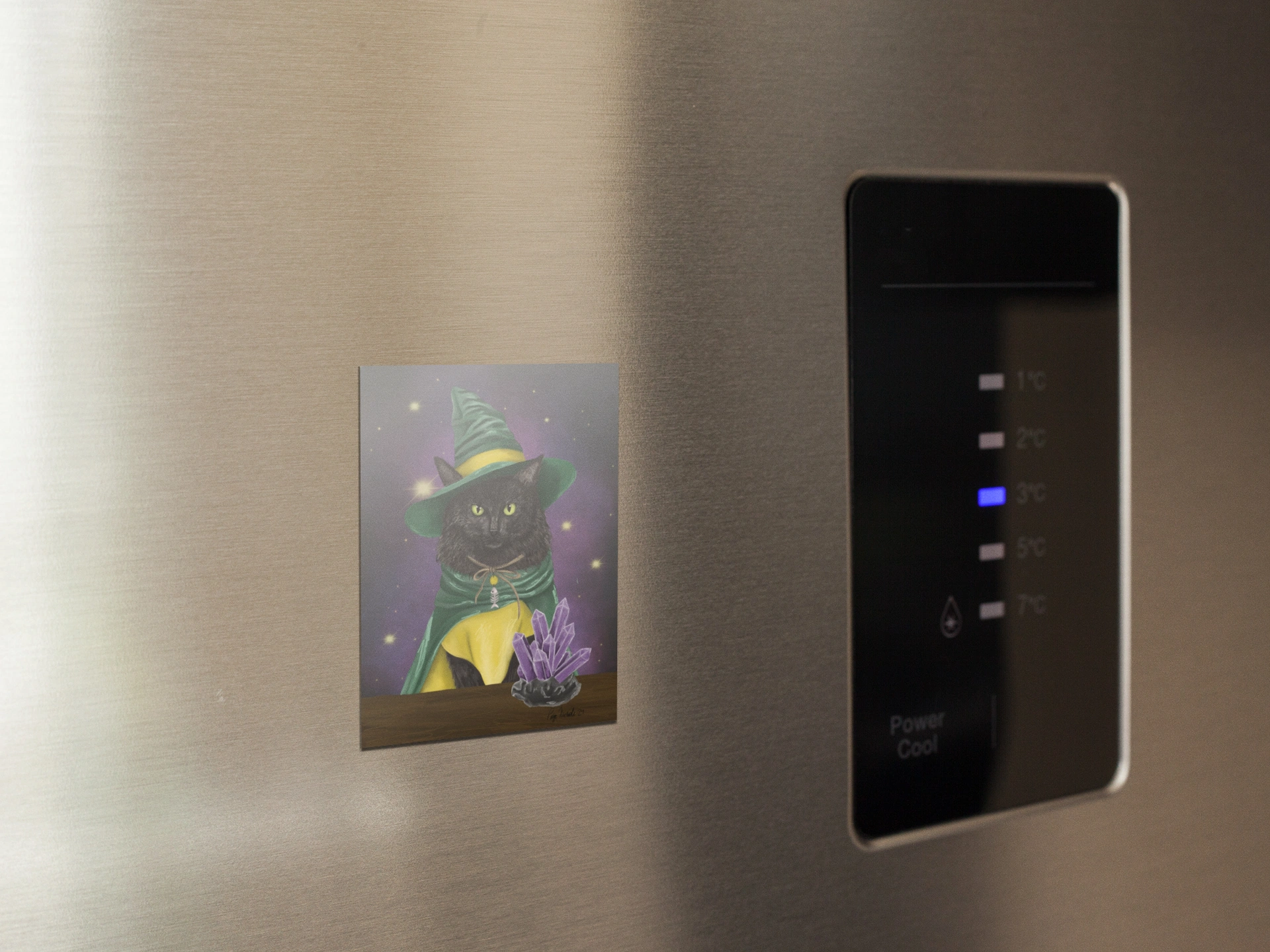 This one-of-a-kind, hand-drawn piece showcases the eerie feeling of crystals from the Witch Kitty and is available as a magnet in 3 sizes. Originally created using an Ipad/Procreate, each design is printed on museum-quality matte paper using a multicolor, water-based inkjet technique, then carefully mounted onto a DIYMAG magnet sheet